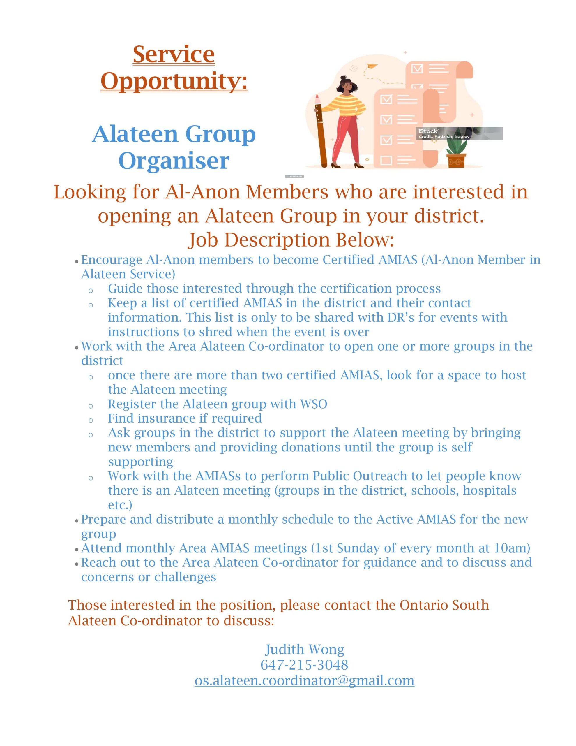 Those Interested in the position :Please contact Ontario South Alateen Coordinator: Judith Wong(647-215-3048)os.alateen.coordinator@gmail.com